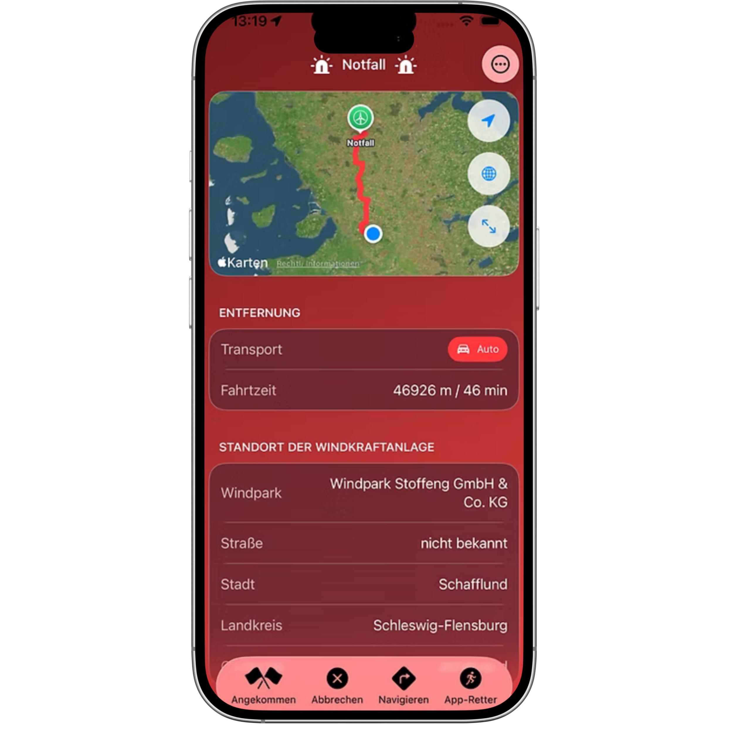 Die integrierte Navigation leitet Helfer präzise zur betroffenen Windkraftanlage und zeigt sowohl den optimalen Zufahrtsweg als auch den exakten Standort innerhalb des Anlagenbereichs an. Gerade in weitläufigen Windparks oder bei schwer zugänglichen Anlagen ist eine klare und eindeutige Routenführung entscheidend für eine schnelle Reaktion.